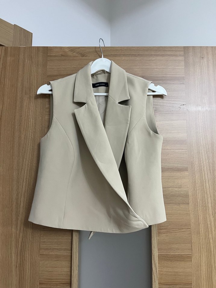 Bej süet kumaştan, kolsuz ve düğmeli, kısa boy, regular fit mini yelek. Ofis ve günlük şıklık için uygundur.