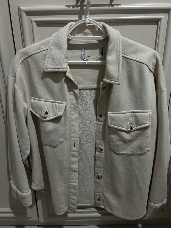 Düğmeli, bej süet kumaştan, cep detaylı ve uzun kollu kadın ceket. Salaş kesimi ve çıtçıtlı yakası.