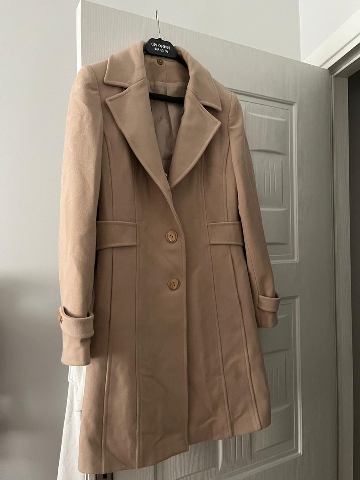 Bej süet kumaştan yapılmış, düğmeli ve normal boy midi kaban. Uzun kollu, klasik kesim ve desen içermeyen tasarıma sahiptir.