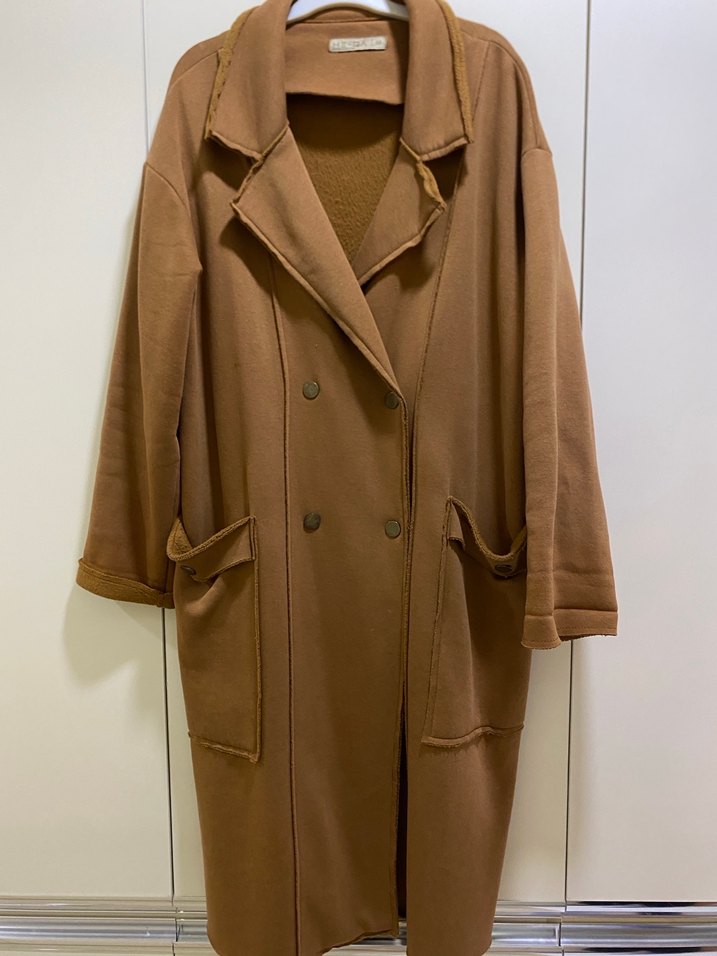Bej renkli süet kumaştan yapılmış, düğmeli uzun kadın kaban. Geniş kesim ve cepleriyle rahat bir kullanım sunar.