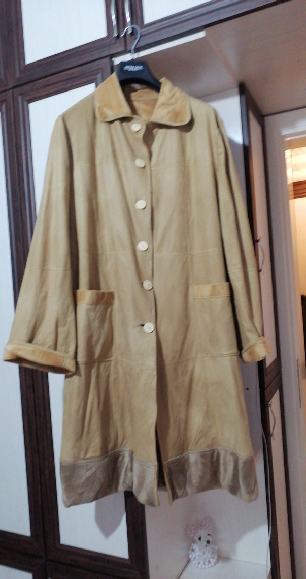 Bej renkte, düğmeli ve kesik yaka detaylı uzun süet kadın kabanı. Uzun kollu, regular fit ve cepli, günlük kullanıma uygun. Fotrafdaki rengi 44 46 arası olur