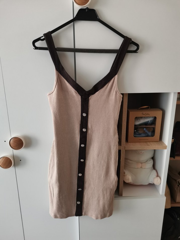 Düğmeli ön kısmı ve V yaka tasarımıyla bej süet midi elbise, kolsuz ve vücuda oturan kesime sahiptir. Günlük sokak stili için uygundur.