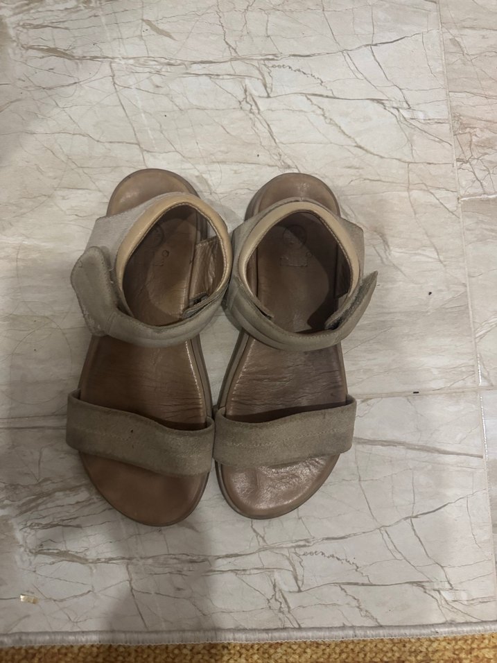 Bej süet kadın sandalet, tokalı kayışlı, minimalist ve desensiz tasarım, trend günlük kullanım için. Elleden çok pahalı bir fiyata almıştım dünyanın en rahat sandaleti severek kullandım üstü suet taban kısmı gerçek deri görünün kir değil deri rengi o hale geldi