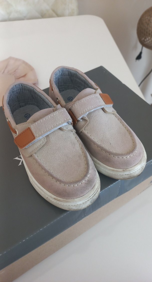Bej süet malzemeden yapılmış, tokalı ve gri astarlı erkek çocuk ayakkabısı, trend sokak tarzı için uygundur.