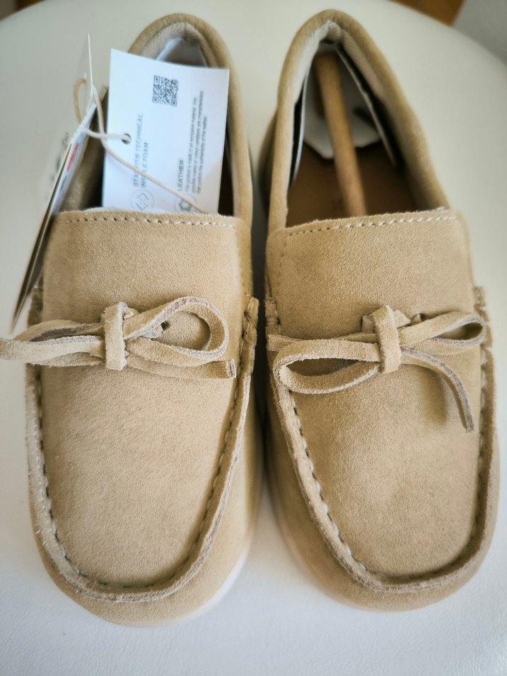 #zara Bej süet malzemeden yapılmış, tokalı ve desen içermeyen erkek çocuk loafer ayakkabılar, rahat ve pastel tonlarda.