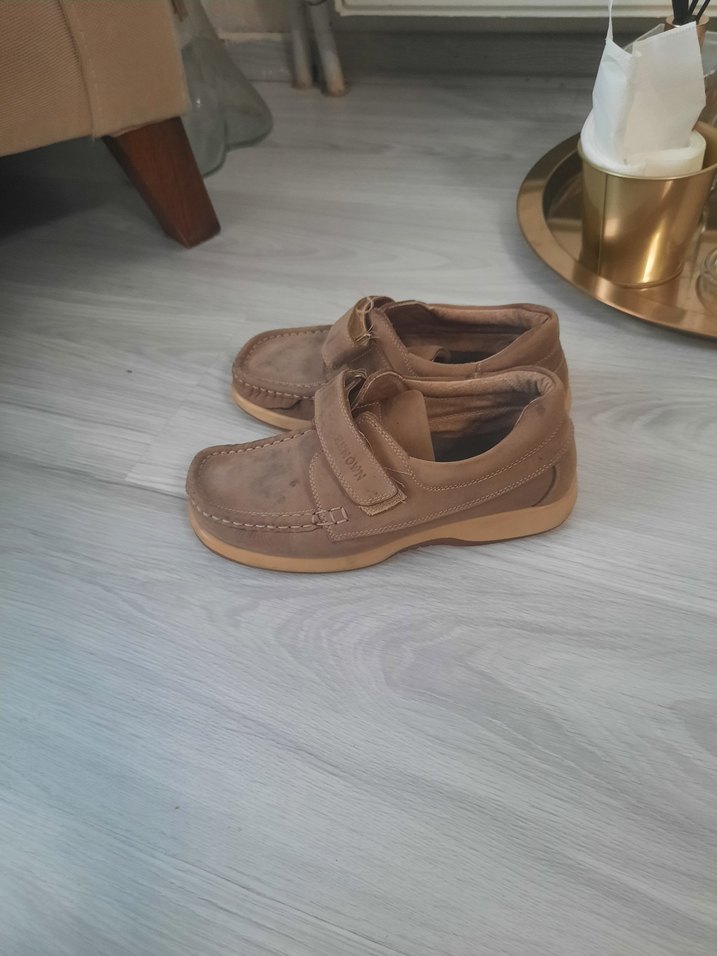 Bej süet erkek çocuk ayakkabısı, tokalı ve desensiz sade tasarıma sahip. Özel günler için uygundur.