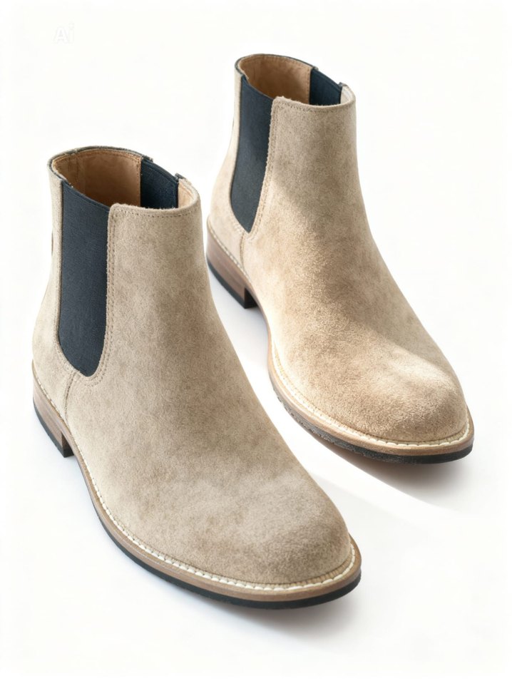 Bej süet erkek Chelsea botlar, gri elastik yan panellerle minimalist ve şık bir görünüm sunar. Günlük kullanım için rahat ve çağdaş tasarım.