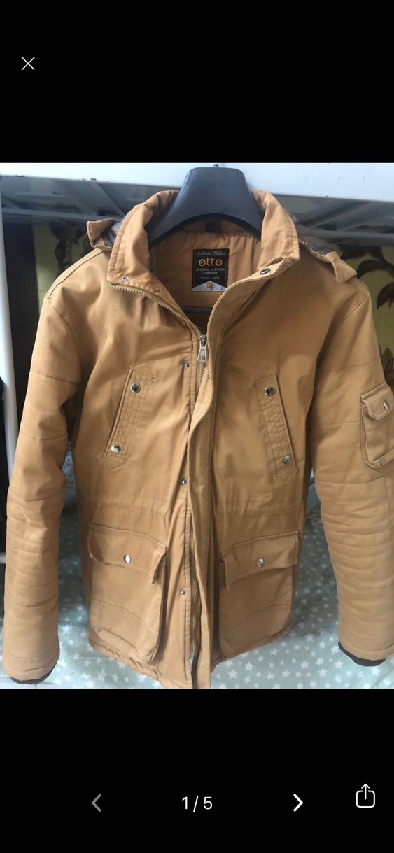 Bej süet kumaştan yapılmış, ve çıtçıtlı cepleri olan erkek ceket. Orta boy, uzun kollu ve regular fit kesimle günlük kullanım için uygundur.