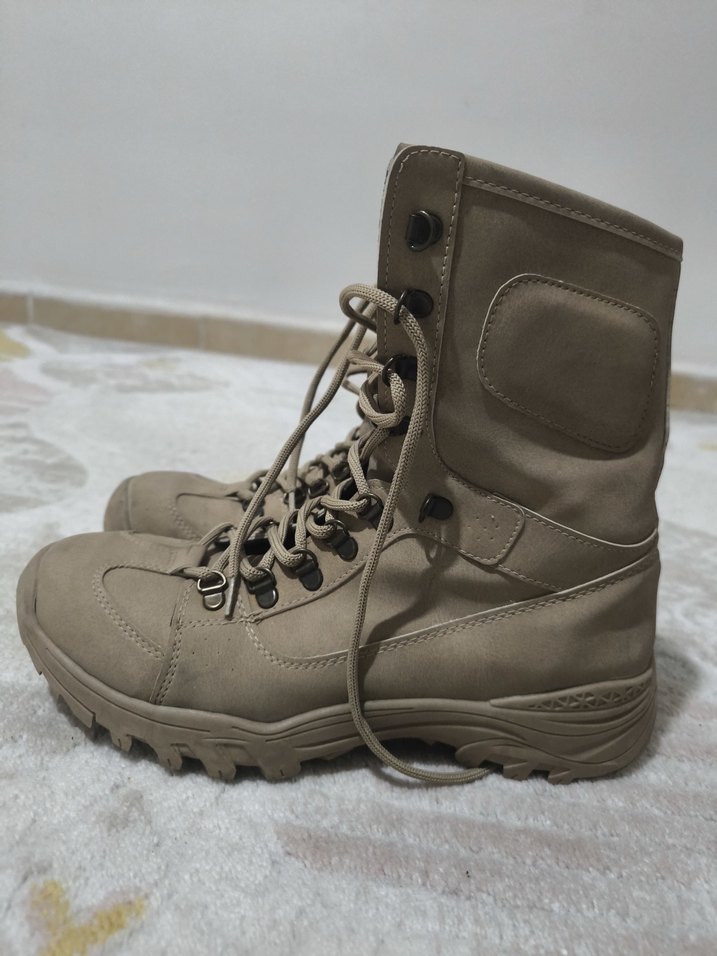 Bej süet malzemeden yapılmış, kemerli tasarıma sahip erkek outdoor botları. Rahat ve şık sokak stili için bağcıklı ve sağlam tabanlıdır.