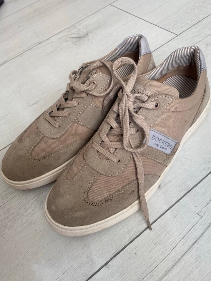 Dockers markalı, bağcıklı bej süet erkek sneakers. Gri detaylara sahip, günlük sokak stili ve athleisure tarzında rahat bir model. Yalnızca 1 kere giyildi.
