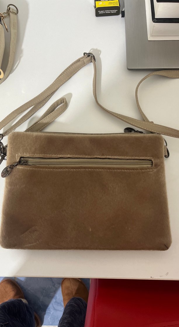 Bej süet kadın çanta, fermuarlı cep ve ayarlanabilir askı ile sade, bohem tarzda günlük kullanım için uygun.