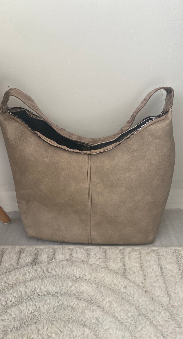 Bej süet malzemeden yapılmış, fermuarlı, sade ve çağdaş tasarıma sahip kadın çantası. Günlük kullanıma uygun, desensiz ve yumuşak dokulu.