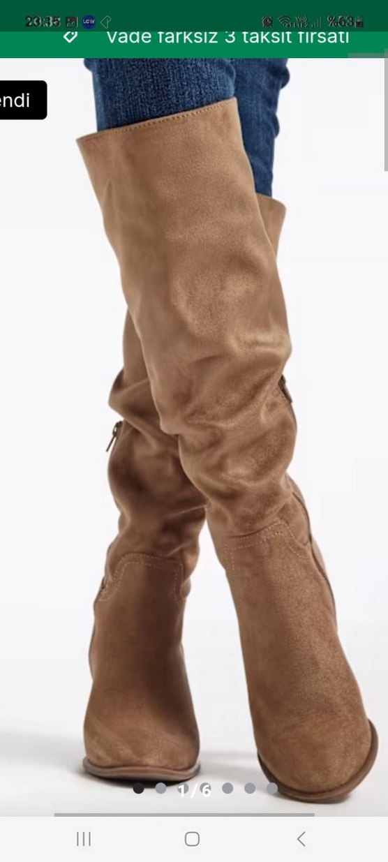 Bej süet dizüstü botlar, kemerli tasarım ve dolgu topuklu. Parlak ve desensiz bu botlar, gündelik sokak stili için uygundur.