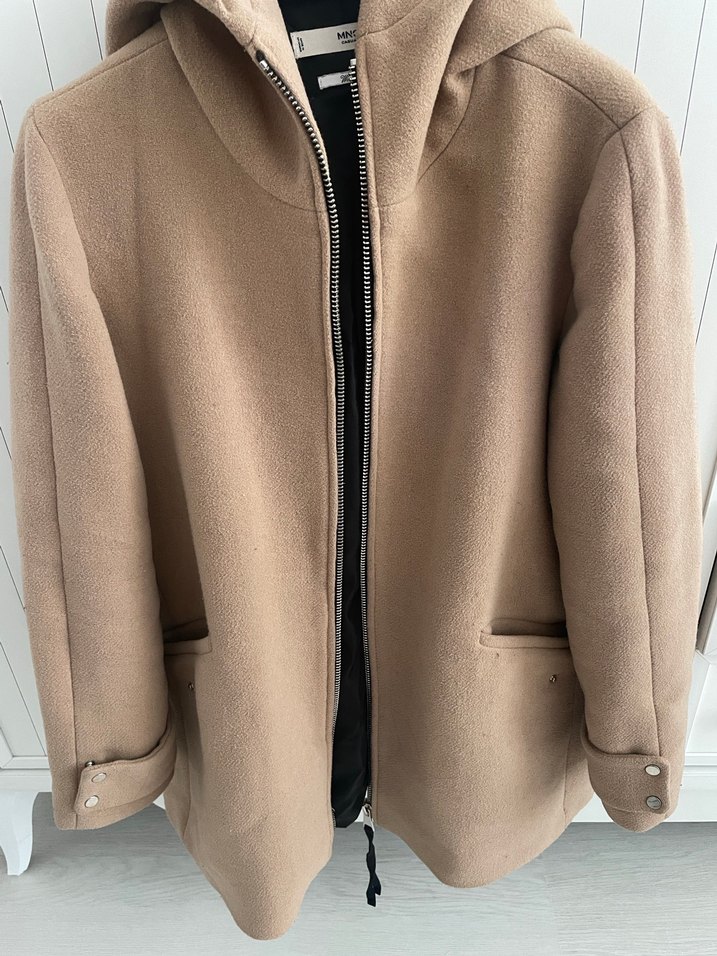 Bej, fermuarlı, bol kesim kadın ceket. Kapüşonlu, uzun kollu ve midi boyda, rahat sokak stili için uygun.