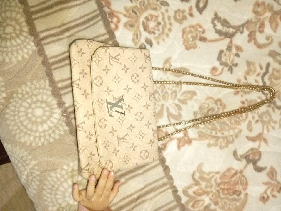 Bej süet kadın çanta, baskılı desen ve kapanışa sahiptir. Zincir askılı, klasik zarafet ve Parisian stilini yansıtan hafif tonlardadır. Çantada "A" ve "&" karakterleri bulunur.