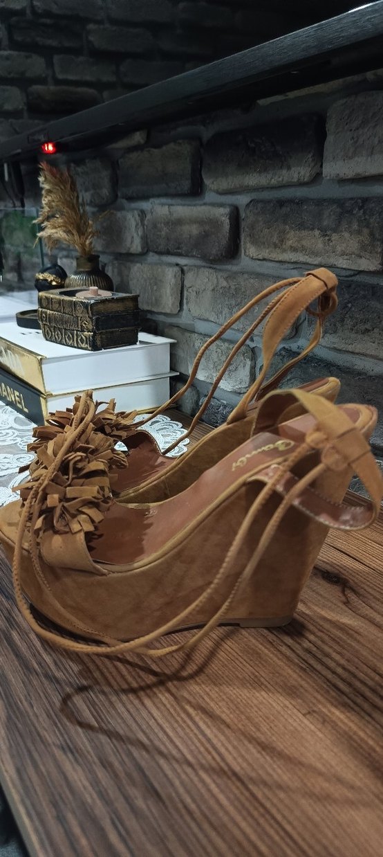 Bej süet malzemeden, fırfır detaylı ve bilekten bağlamalı dolgu topuklu sandaletler. Bohem tarzı için çiçek desenli görünüm sunar. ✨