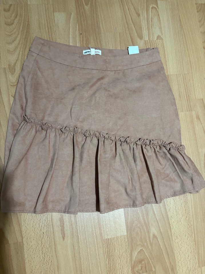 Bej renkte süet kumaştan yapılmış, uç kısmında fırfır detayı bulunan, bol kesim mini etek. Günlük rahat sokak stiline uygundur.