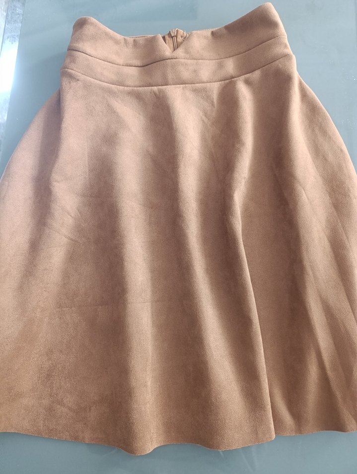 Bej süet hamile midi etek, bol kesim ve drapeli tasarıma sahip. Desensiz ve ofis için uygun.