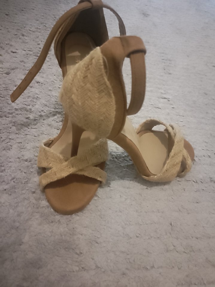 Bej süet hasır detaylı topuklu kadın ayakkabı, tokalı kayışlı, minimalist ve bohem tarzda, romantik akşamlar için uygun, desensiz ve pastel tonlarda.