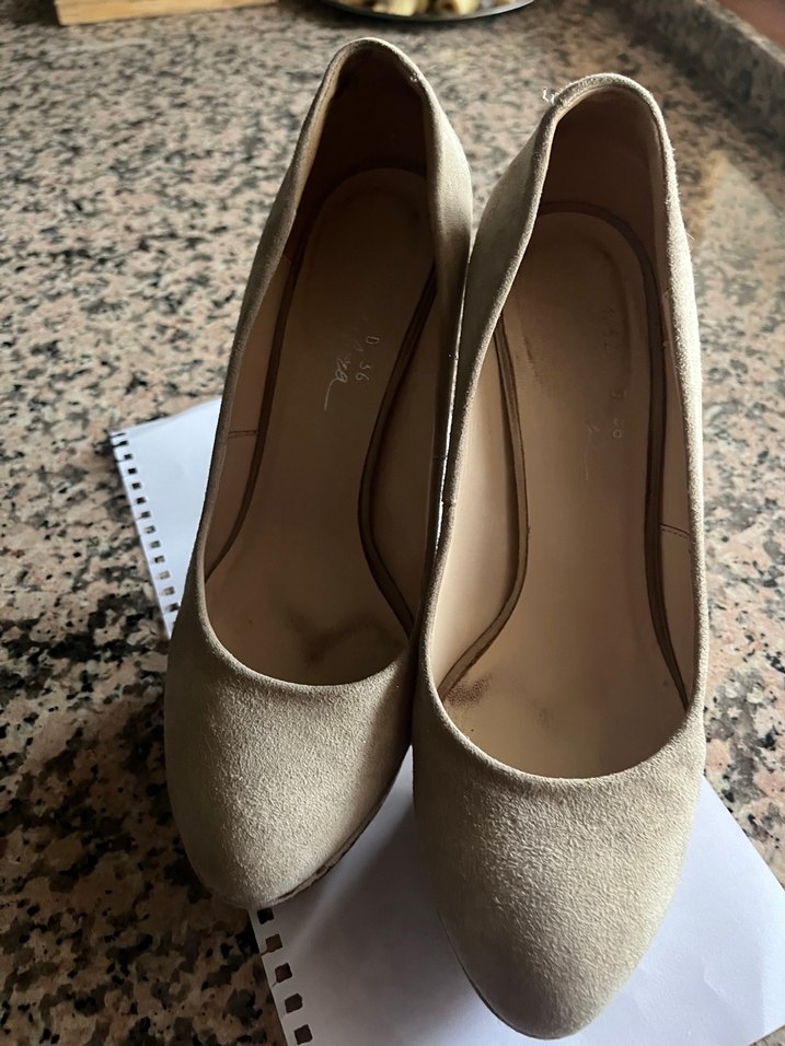 Bej süet malzemeden yapılmış, ince topuklu kadın ayakkabısı. Minimalist ve desensiz tasarımıyla günlük kullanıma uygundur.