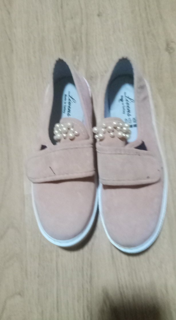Bej süet malzemeden yapılmış, inci detaylı ve düğmeli kız loafer ayakkabılar. Pastel tonlarda, sade ve normcore tarzda rahat bir model.