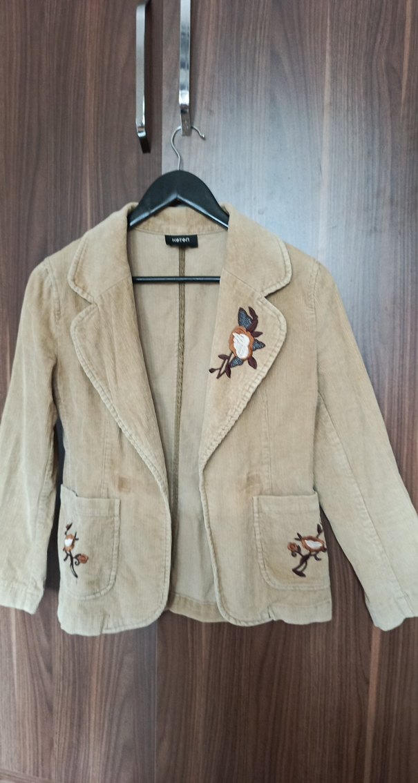 Bej süet kumaştan yapılmış, düğmeli ve işlemeli kısa blazer ceket. Ceplerde ve göğüste çiçek işlemeleri bulunur, uzun kolludur ve ofis için uygundur.
