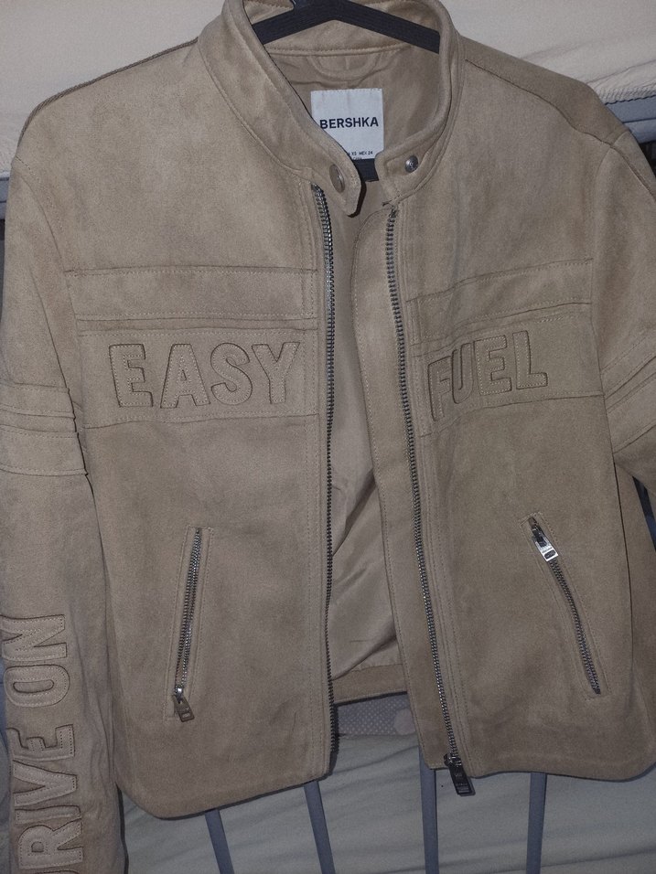 Bej süet biker tarzı kadın ceketi, dar kesim ve normal boydadır. Uzun kollu, bisiklet yakalı, fermuarlı ceplere ve baskılı detaylara sahiptir. Bershka markasıdır.
