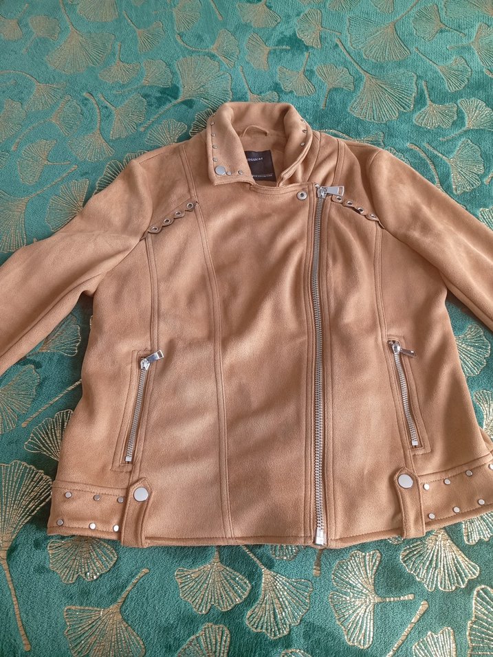 Fermuarlı, parlak bej süet kadın biker deri ceket, çıtçıt detaylı ve yaka kısmı kesik. Normal uzunlukta, uzun kollu ve rahat kesimli, günlük kullanıma uygun.neredeyse hiç kullanmadım.tarzim değil.