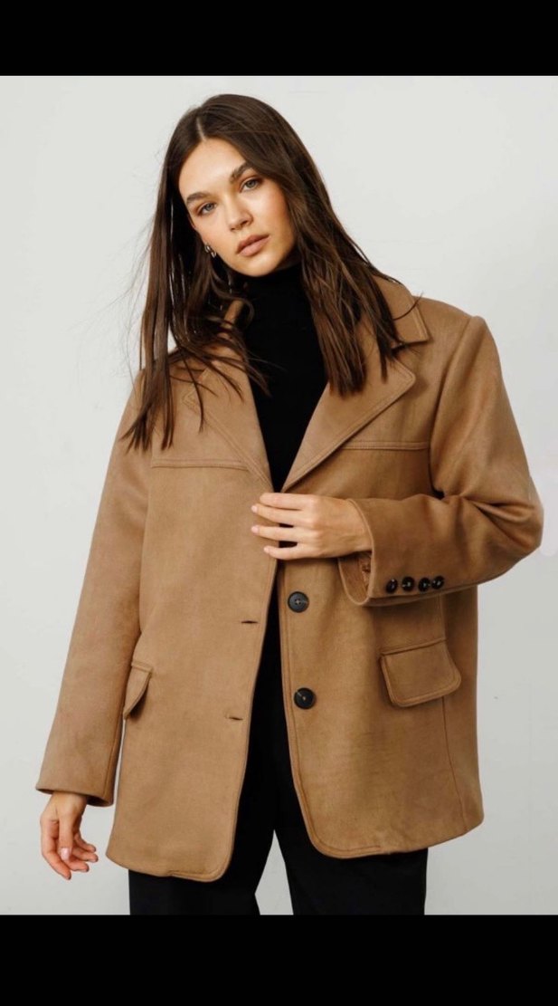 Bej renkte, süet kumaştan yapılmış kadın blazer ceket. Notlu yaka ve uzun kolludur, rahat kesimiyle günlük kullanıma uygundur. Minimalist ve şık tarzı vardır. M-L beden omuz kısmında kalem lekesi var aldığımda da öyleydi
