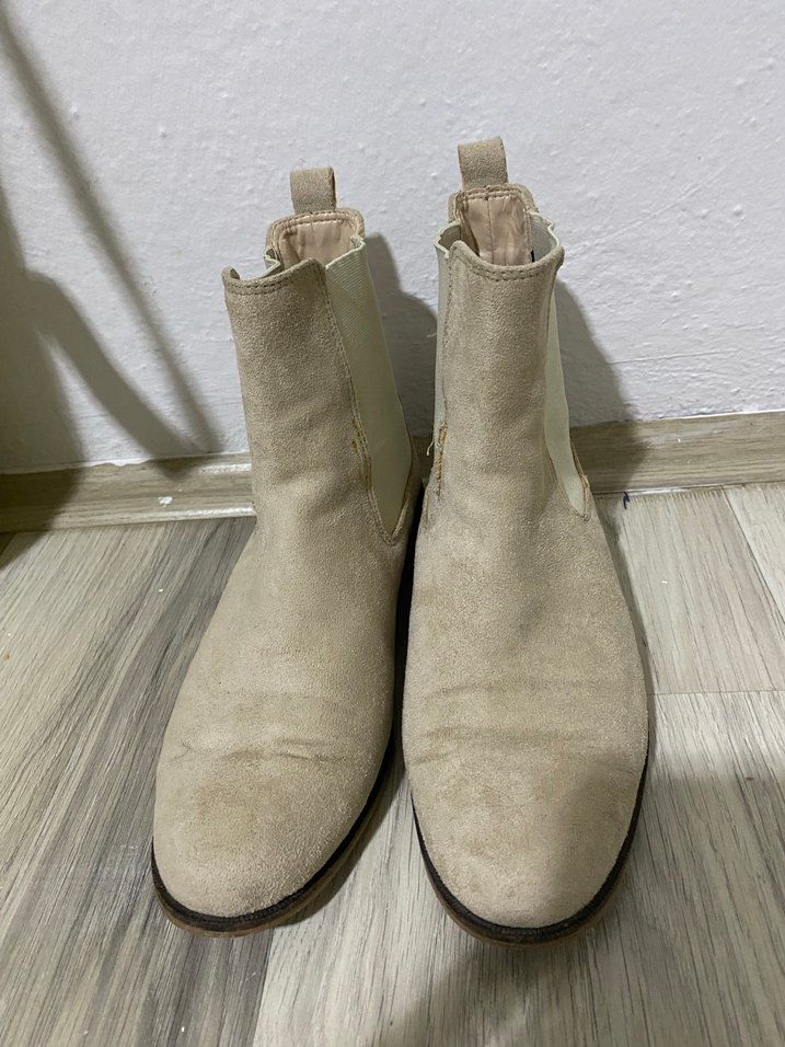 Bej süet kadın botları, blok topuklu, minimal ve desensiz tasarımla rahat ve şık sokak stiline uygun. Günlük kullanım için ideal.