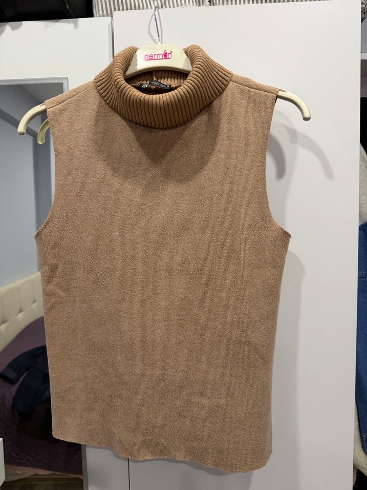 Bej Süet Kadın Boğazlı Kolsuz Triko Süveter