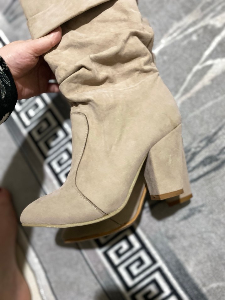 Bej renkte, süet dokulu, kalın topuklu kadın botu, sokak stiline uygun.bir iki kez giyildi iyi durumda