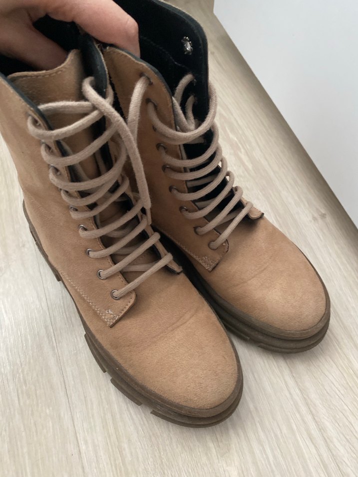 Bej rengi süet bot. 10 kere giyilmemiştir. Altının fotoğrafı hiç silmeden çekilmiş hali. Boyner’den alındı fabrika marka.
