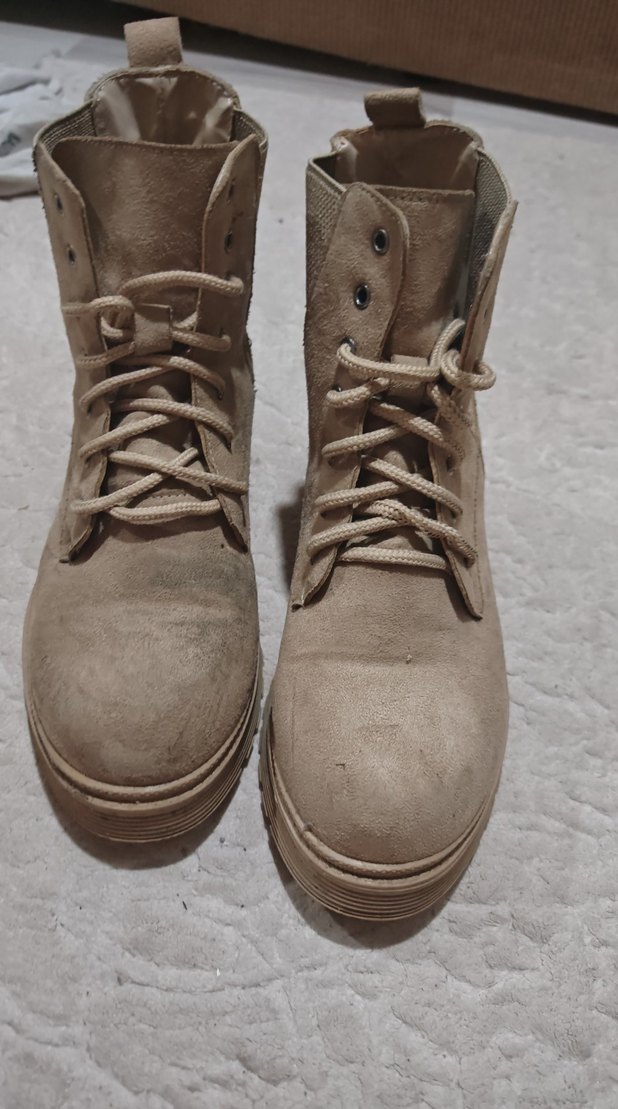 Bej süet kadın botlar, dolgu topuk ve kemer detayına sahip. Bağcıklı ve dayanıklı tabanlı, sokak stili için uygun. Kemersizde kullanabilirsiniz iki gün giydim küçük geldigi için ayağımı rahatsız etti