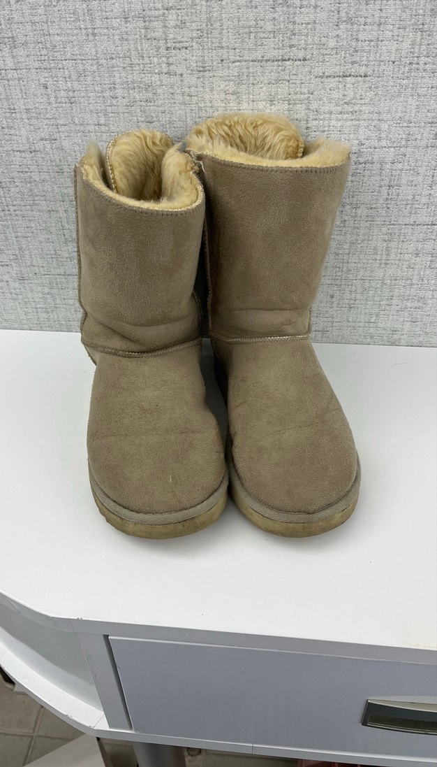 Bej süet kadın botlar, kürklü iç detay ve dolgu topuklu, günlük kullanım için sade ve rahat bir tasarıma sahip. Kirli olması dışında sorun defo yok,silip göndericem