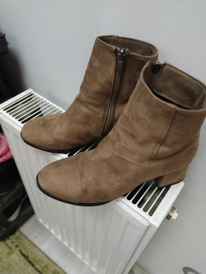 Bej süet kadın botlar, kalın topuklu ve fermuar detaylara sahip, günlük kullanıma uygun, şık ve rahat bir modeldir.