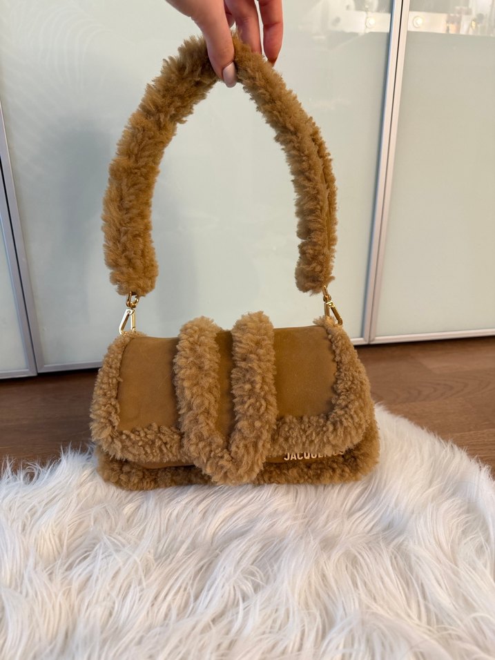 Bej süet kadın çanta, kürk detaylı ve nakışlı. Rahat, normcore tarzında, çıkarılabilir omuz askılı. Marka: JACQUEMUS