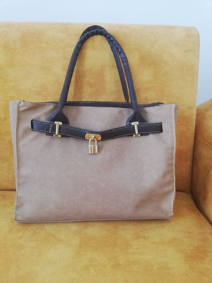Bej süet kadın çanta, tokalı detaylar ve gri kulplarla, günlük kullanıma uygun çağdaş tarzda. hiç kullanılmadı yeni içi leopar desenli kumaş kaplı