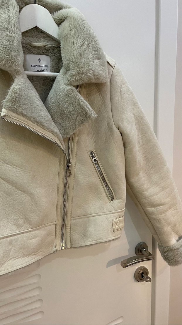 Bej süet kadın ceket, kürklü detaylı ve kesik yaka.