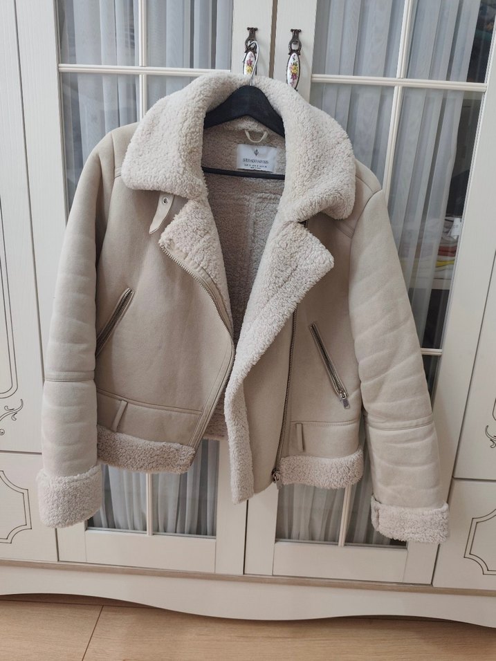 Bej süet kadının kürklü yakalı ve manşet detaylı bol kesim ceket. Midi boy, deseniz, rahat sokak stili için uygun. ürün sayılı kullanıldı temizdir kemeri mevcut değil