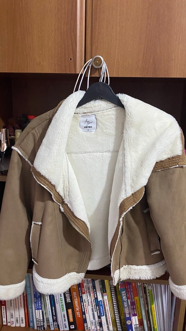 Bej süet kadın ceketi, kürklü detaylı ve kesik yaka. Rahat kesim ve normal boyda, sokak modasına uygun.