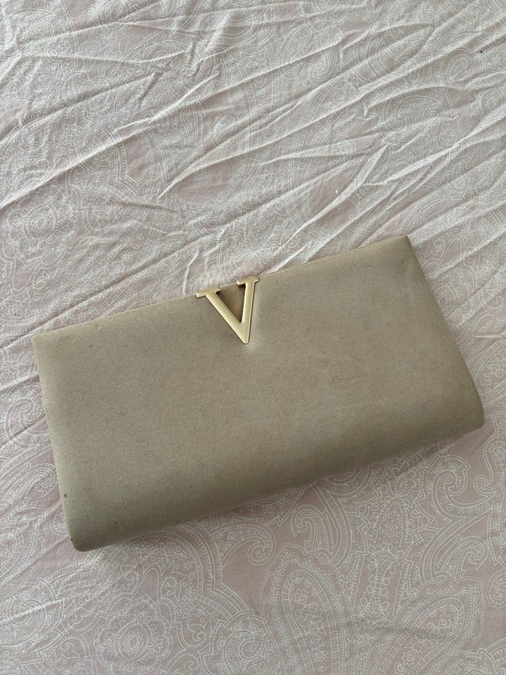 Bej süet malzemeden yapılmış, modern klasik tarzda, kemerli tasarıma sahip ve hafif gri tonlu kadın clutch çanta. Günlük kullanıma uygun, Paris esintili şıklık.