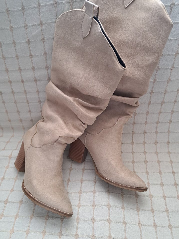 Bej süet diz boyu botlar,blok topuklu tasarımıyla rahat ve bohem bir stil sunar.