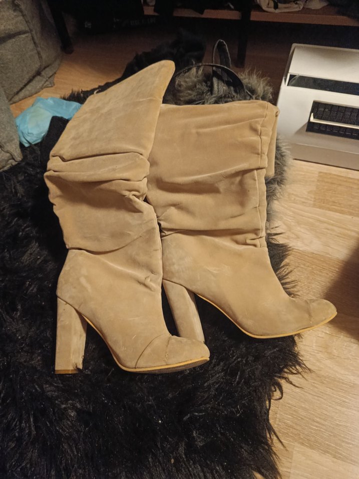 Bej süet dizüstü çizme, kalın topuklu ve kürk detaylı, günlük kullanıma uygun şık ve rahat bir model. defosu var ekledim