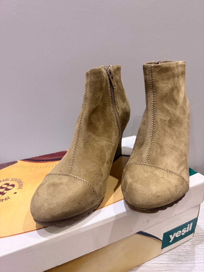 Bej süet kadın botlar, dolgu topuklu ve yan fermuarlı. Desensiz tasarımıyla rahat ve şık, günlük kullanıma uygun.