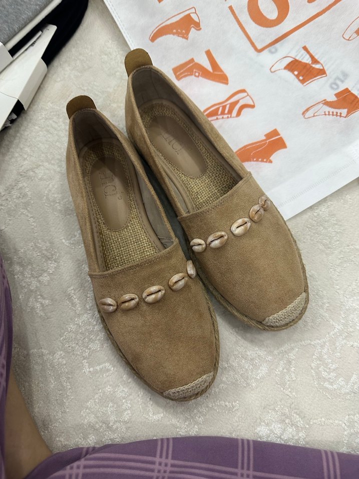 Bej süet kadın espadril, dolgu topuklu ve nakışlı kabuk detaylı. Tokalı tasarımıyla günlük rahat kullanıma uygundur.