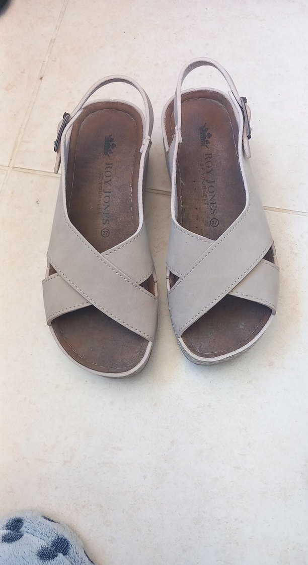 Bej süet malzemeden yapılmış, dolgu topuklu ve tokalı kadın sandaletleri. Desensiz, minimalist tasarımı günlük kullanıma uygun sade bir stil sunar. Roy Jones markası.