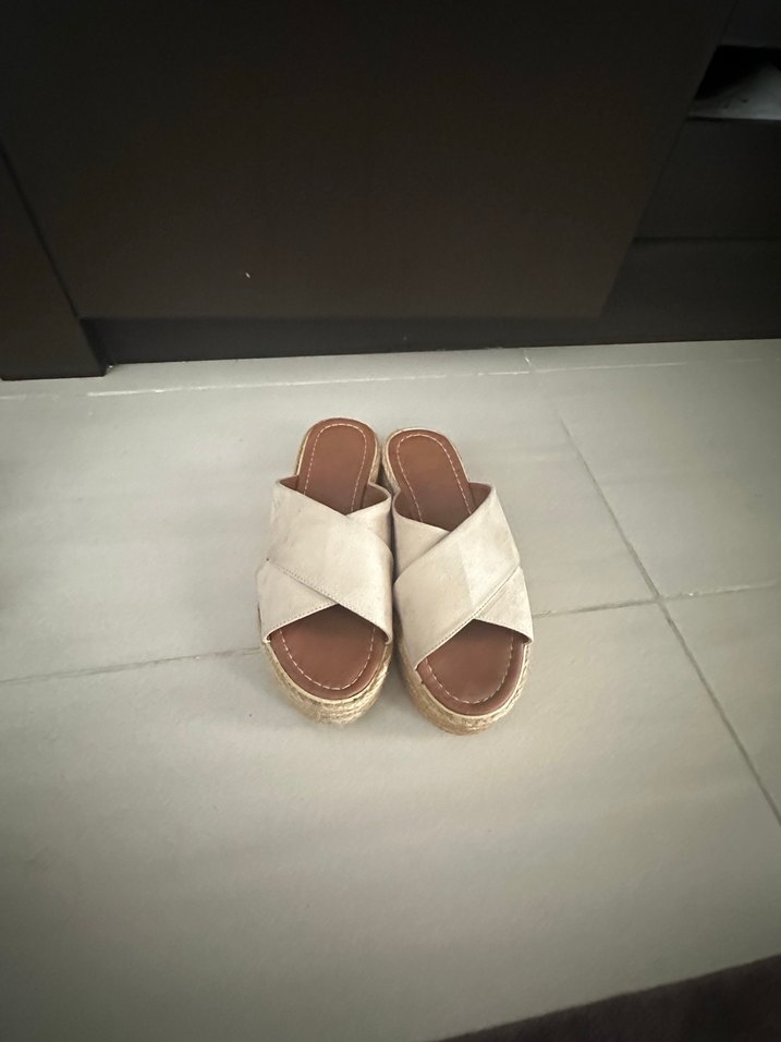Bej süet kadın terlik, dolgu topuklu ve desen içermeyen minimalist tasarıma sahip. Bohem tarzıyla günlük kullanıma uygun, zahmetsiz şıklık sunar.