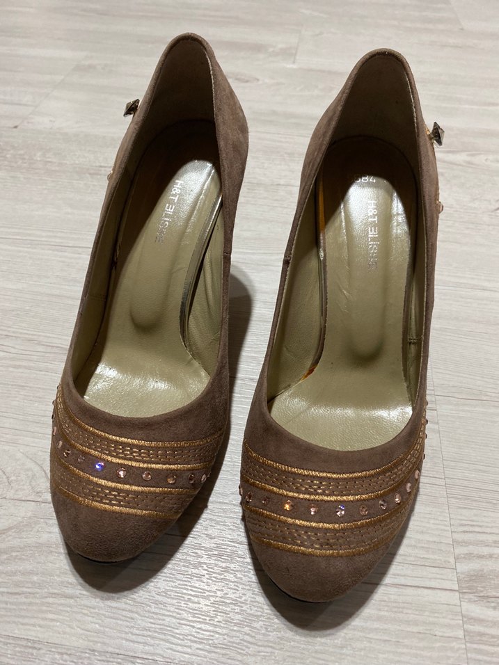 Bej süet malzemeden yapılmış, tokalı ve parlak detaylara sahip dolgu topuklu kadın abiye ayakkabı.