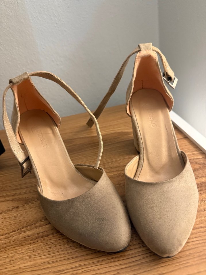 Bej süet malzemeden yapılmış, tokalı bantlı kadın dolgu topuklu ayakkabılar. Minimalist ve çağdaş tasarıma sahip, günlük kullanıma uygun.